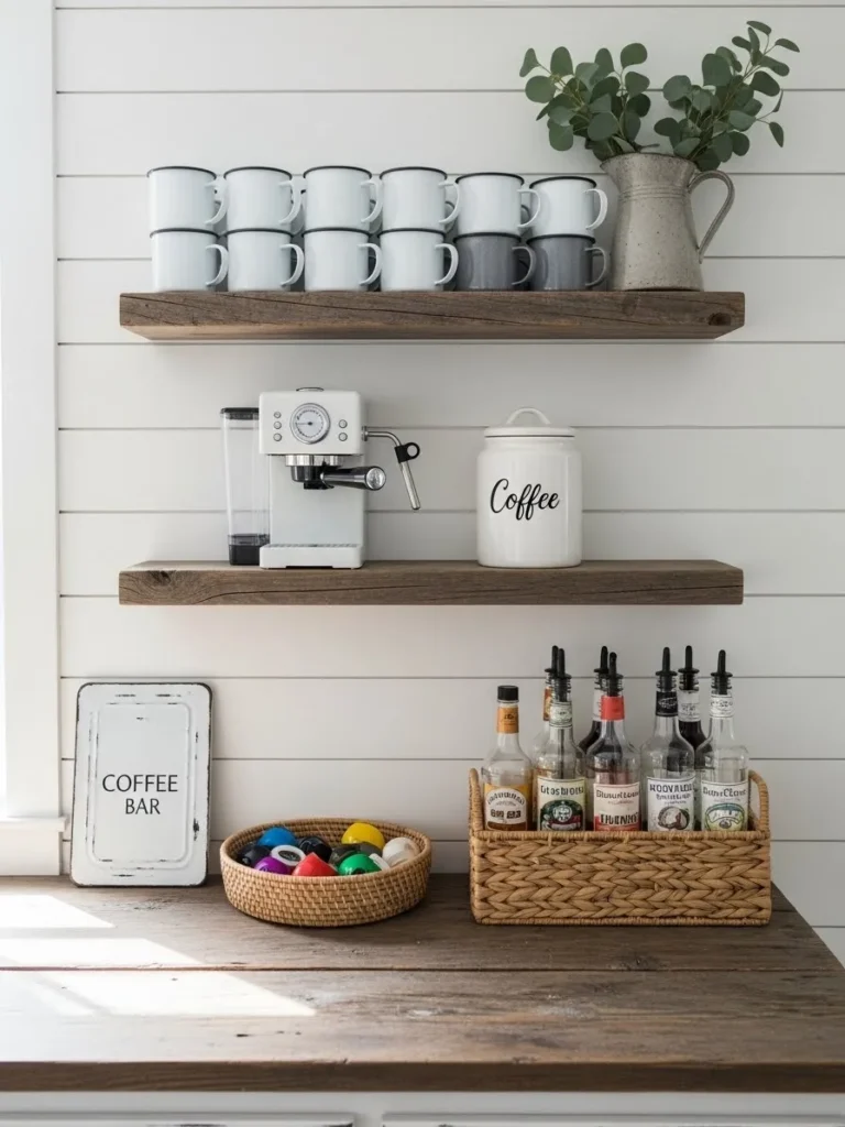 I adore this setup because it feels like the kind of spot that makes mornings instantly better. There is something so charming about having all your coffee essentials displayed in such an organized and pretty way. I can imagine standing here each morning choosing a mug that fits my mood and pretending I run my own cozy farmhouse café. It is simple, stylish, and honestly just makes me smile.