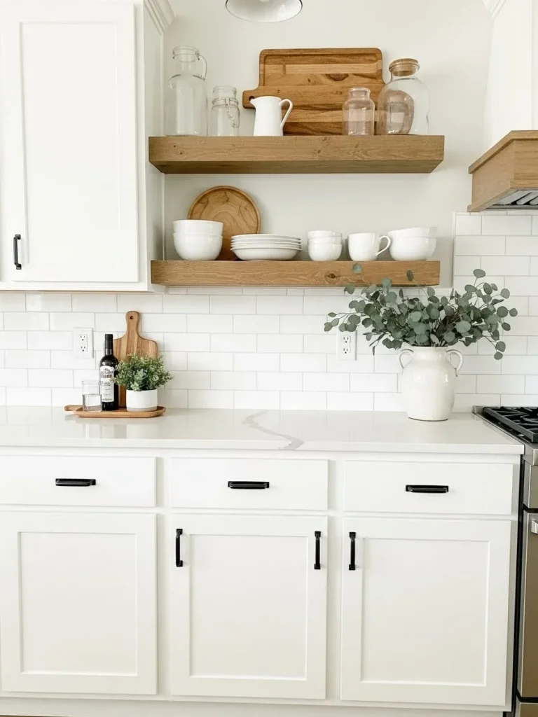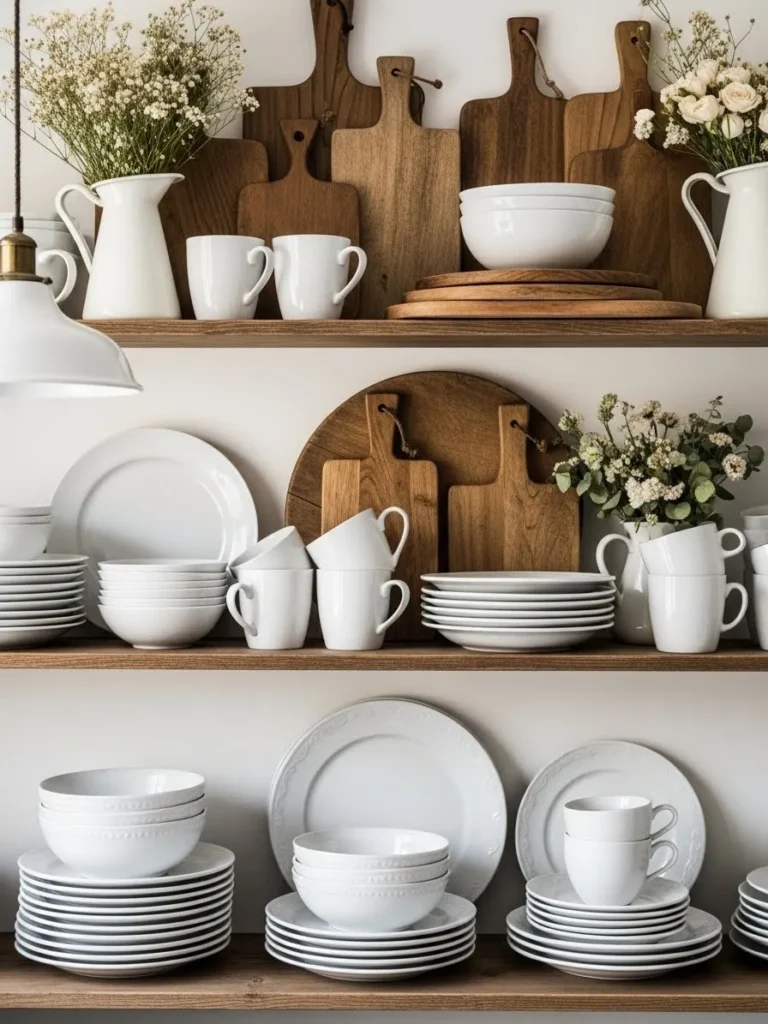 This farmhouse setup brings together everything I adore about open shelving. The rich wooden cutting boards create the prettiest layered backdrop and instantly warm up the entire wall. The crisp white plates, bowls, and mugs feel fresh and clean while the stacked arrangement keeps everything looking tidy and intentional. I love how the ceramic pitchers filled with soft flowers add a gentle feminine touch that balances the rustic wood. The mix of textures feels simple but so thoughtfully pulled together.