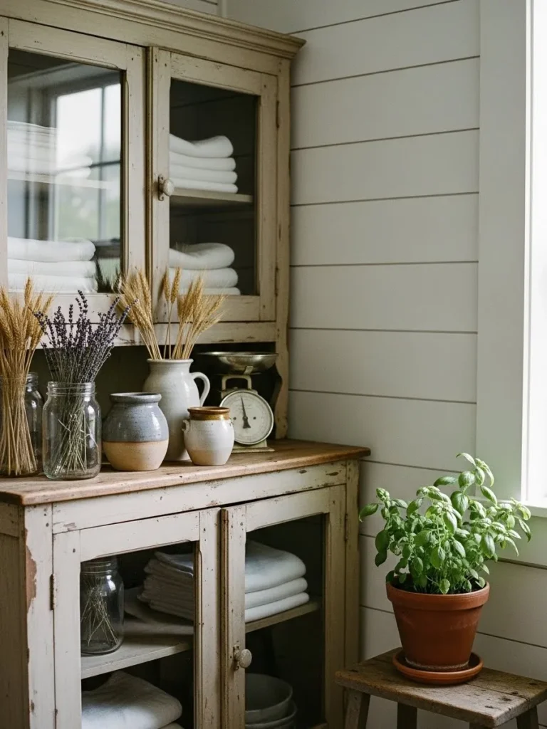 This sweet little farmhouse moment brings together everything I adore about rustic simplicity. The weathered cabinet feels perfectly loved with its soft cream finish and gentle distressing that gives it so much character. Stacks of fresh white linens sit behind glass doors and instantly make the whole space feel calm and collected. The mix of stoneware jugs, mason jars filled with dried stems, and an old-fashioned scale adds that honest homestead touch that never goes out of style. A small potted basil plant sits on a wooden stool nearby and brings a breath of life to the room with its lush green leaves. The whole setup is bathed in natural window light that makes every texture feel warm and inviting.