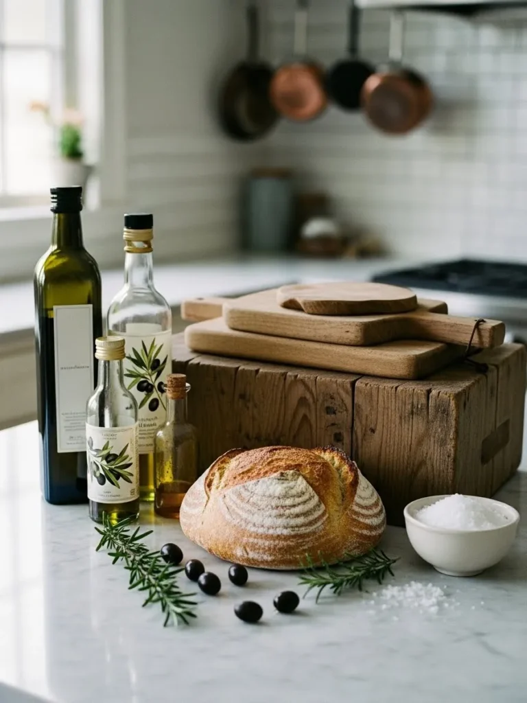 This farmhouse kitchen moment captures that perfectly effortless rustic charm with a cluster of wooden cutting boards stacked neatly on a chunky reclaimed wood block. The soft marble countertop brightens everything and creates the prettiest contrast with the warm tones of the boards and the golden olive oils. Fresh rosemary sprigs and a crusty artisan loaf add a touch of European farmhouse flavor that feels both cozy and stylish. The copper pans hanging in the background bring in just the right amount of vintage character without overwhelming the space.