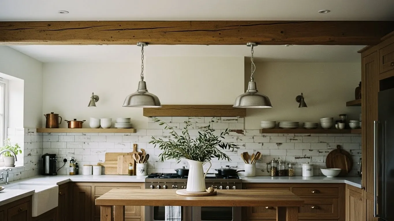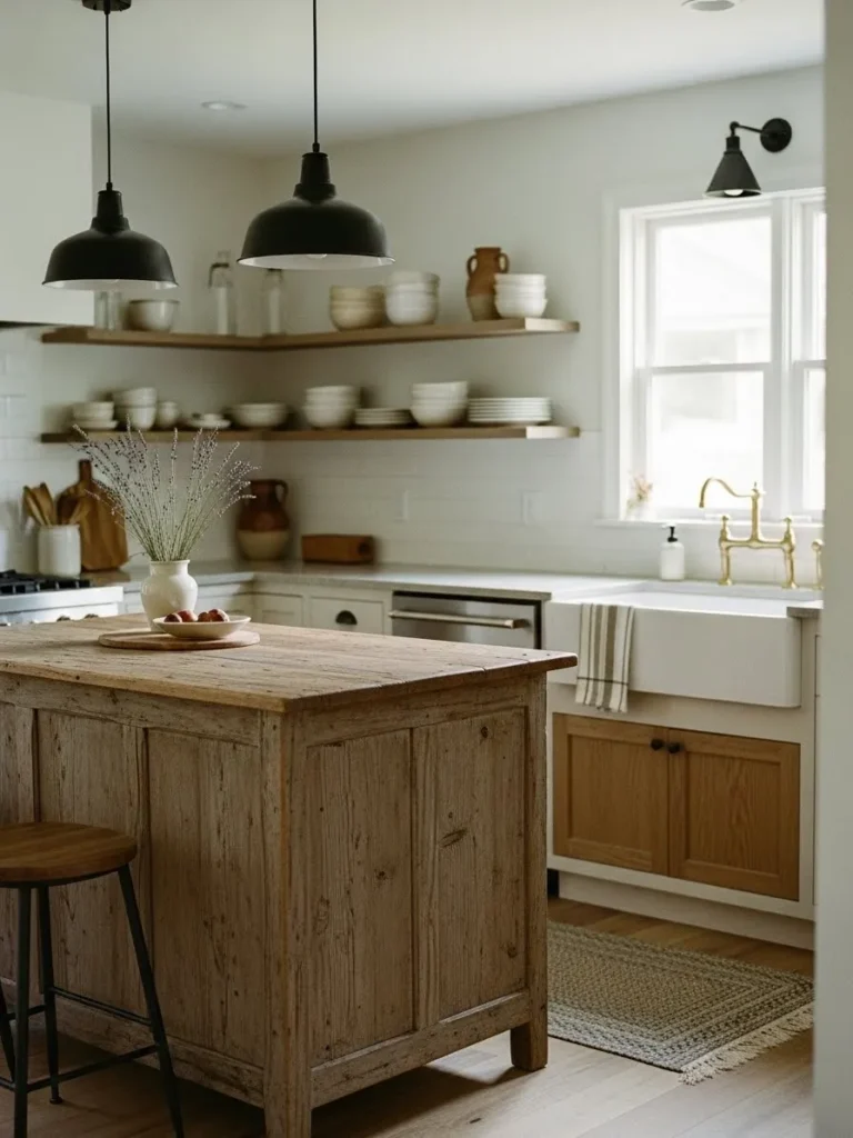 This kitchen brings together that cozy farmhouse feeling with a clean modern touch. The warm wood island immediately sets the tone with its perfectly weathered finish that looks like it has stories to tell. Open shelving keeps everything airy and inviting, lined with simple ceramic bowls that create the prettiest everyday display. The sleek black pendant lights add a lovely contrast to all the soft neutrals, and the farmhouse sink paired with brass fixtures gives the whole space an elevated yet laid back vibe. Every element feels intentional without trying too hard which is exactly what makes farmhouse kitchens so charming.