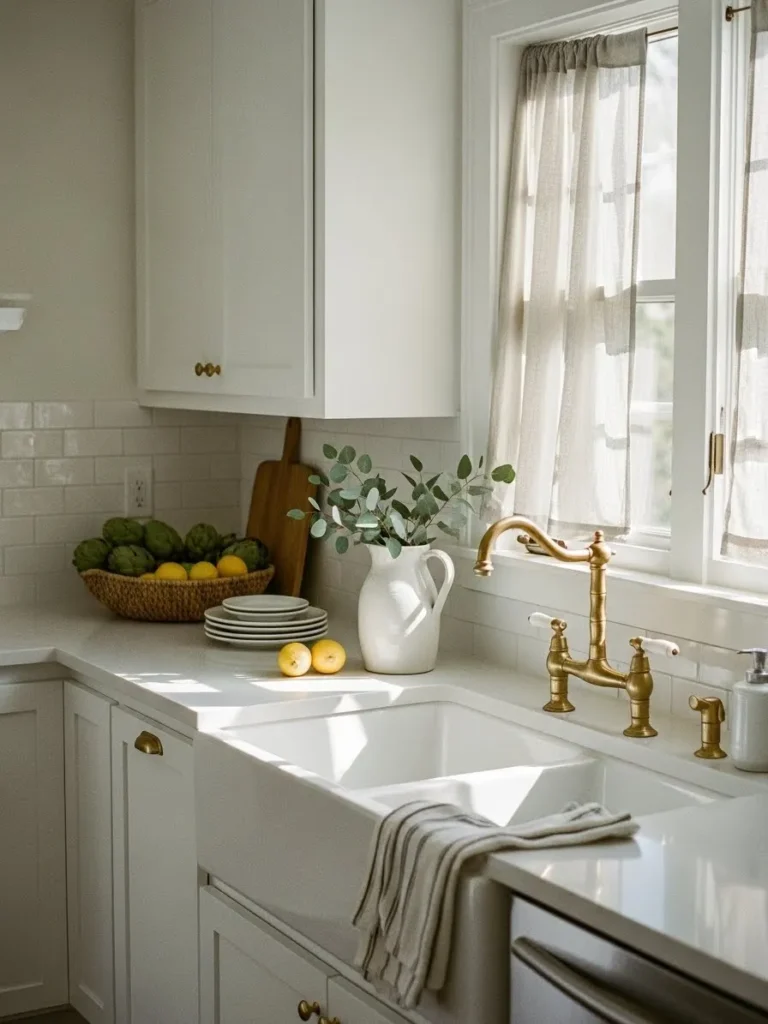 This kitchen has that sweet and simple farmhouse charm that feels instantly calming. The classic apron front sink sits beautifully beneath a window trimmed with soft linen curtains that let the light pour in just right. Warm brass taps add a little glow without trying too hard. The creamy cabinets have a clean, timeless look and the small touches make everything feel thoughtfully placed. A basket of artichokes and lemons, a stack of everyday plates, and a white pitcher with fresh eucalyptus give the space that lived in but still effortlessly chic vibe.