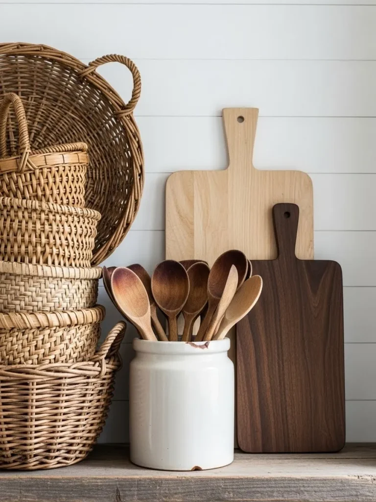 This design brings together a lovely mix of woven textures and natural wood that instantly feels inviting. The stacked baskets add height and charm while the cutting boards in soft and dark wood tones balance the look with clean lines. The simple white crock filled with wooden spoons ties everything together in the sweetest way and the shiplap backdrop keeps the entire vignette light and classic. It is the kind of little corner that looks effortless but still feels thoughtfully styled.