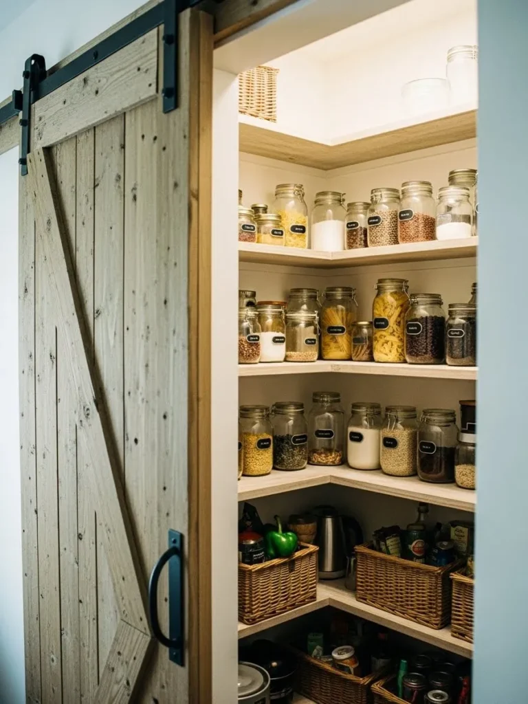 This cozy farmhouse pantry feels like the kind of space that makes everyday cooking a little sweeter. The natural wood sliding door instantly sets the tone with its warm, rustic personality, and once it rolls open you’re met with beautifully arranged shelves filled with neatly labeled jars and woven baskets. Everything has its own little home, from grains and pasta to snacks and spices, and the soft neutral palette keeps the whole nook feeling calm and intentional. The layered textures from the wicker baskets, glass jars, and raw wood create that effortless farmhouse vibe while still keeping the space totally functional.