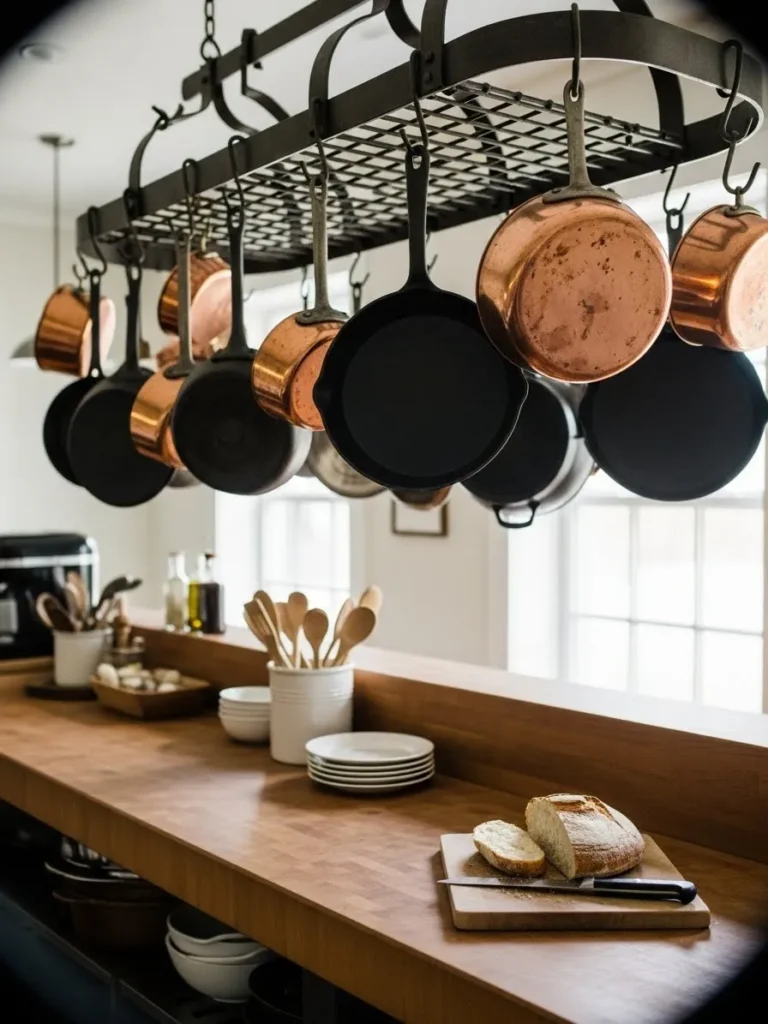 This kitchen brings such a warm farmhouse feeling with its gorgeous hanging rack filled with copper pots and cast iron pans. The wooden countertop adds a cozy touch and feels wonderfully lived in, especially with the fresh loaf of bread waiting to be sliced. The soft natural light from the large windows brightens everything and makes the whole space look like the heart of a home where cooking is slow, comforting, and shared. Simple white dishes and wooden utensils keep the look clean and classic while still feeling practical for everyday life.