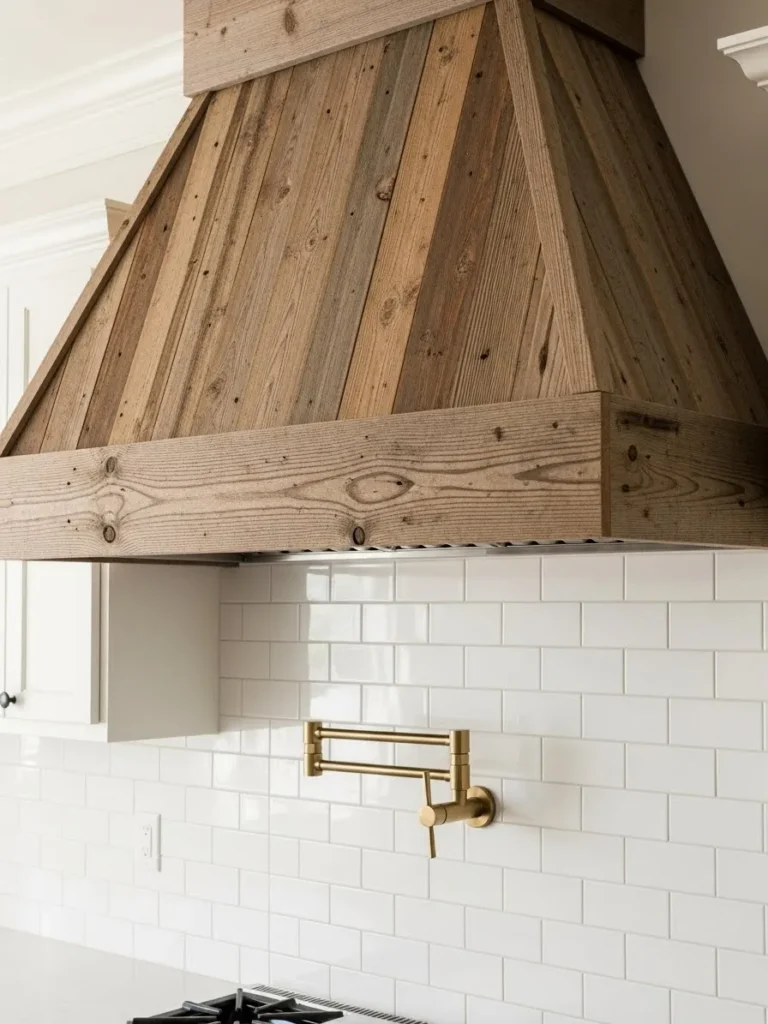 This farmhouse kitchen design blends warm rustic charm with a crisp modern backdrop in the prettiest way. The star is the oversized wooden range hood made from wide planks in soft weathered tones that instantly add texture and personality. The diagonal pattern gives it a handcrafted look that feels both bold and timeless. Paired with classic white subway tile and a sleek brass pot filler, the whole space balances cozy farmhouse soul with clean contemporary style.
