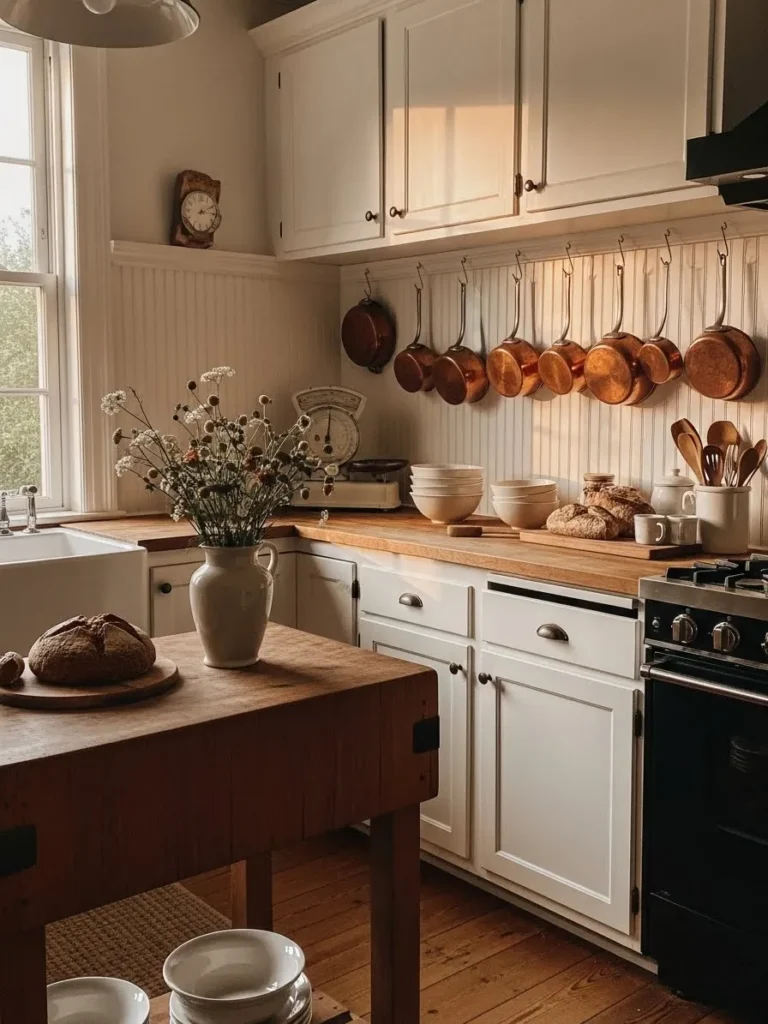 This lovely farmhouse kitchen blends soft creamy cabinetry with warm wood countertops that instantly set a cozy mood. The sunlight drifts in through the tall window and makes the row of copper pans look like little pieces of artwork. A chunky butcher block table sits at the center with rustic charm and just enough texture to make everything feel homey. The beadboard walls, the vintage scale and the simple ceramic bowls create that perfect lived-in balance without feeling cluttered. Every detail feels intentional yet relaxed in the best farmhouse way.
