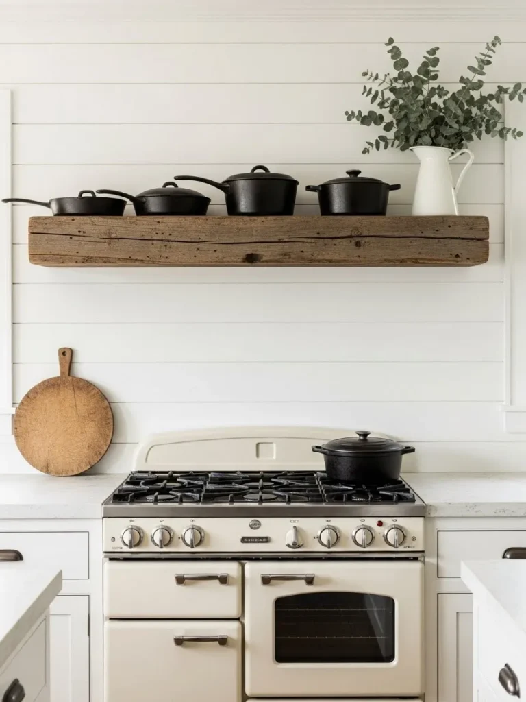 This kitchen shows off the sweetest mix of rustic charm and clean farmhouse style. The chunky weathered wood shelf instantly steals the spotlight with its natural grain and perfectly imperfect character. Lined with matte black cast iron cookware and paired with a simple white pitcher filled with fresh greenery, it creates a look that feels collected over time rather than decorated in a rush. The creamy vintage style stove adds even more warmth to the space and ties beautifully with the crisp white shiplap walls and soft neutral cabinetry. Everything feels calm and balanced in that effortless way farmhouse lovers dream about.