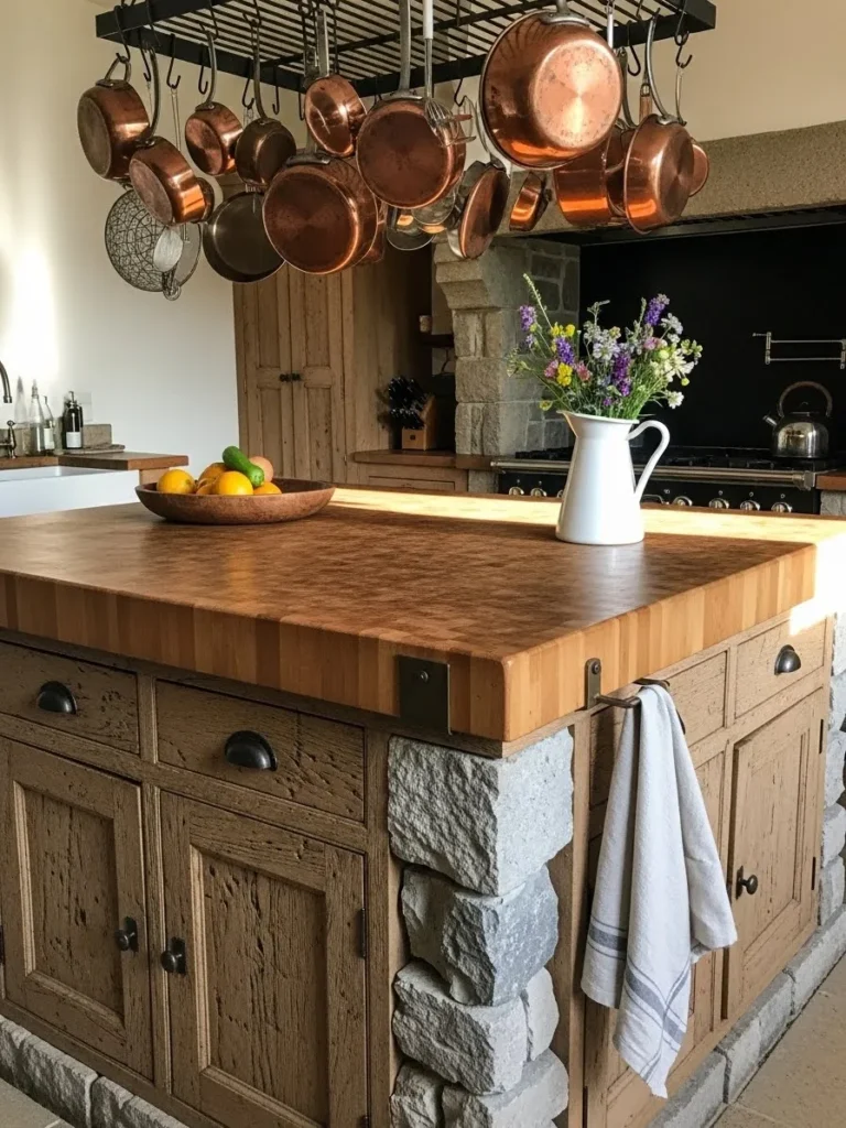 This farmhouse kitchen brings together the most charming rustic details in the prettiest way. The chunky stone base of the island adds a cozy country feel while the warm butcher block top makes the whole space feel inviting and lived in. A collection of copper pots hangs above like a little piece of kitchen jewelry and the soft wood cabinetry ties everything together with that perfect worn in look. Even the simple touches like the pitcher of fresh flowers and the bowl of citrus add a sweet pop of color that makes the room feel bright and happy.