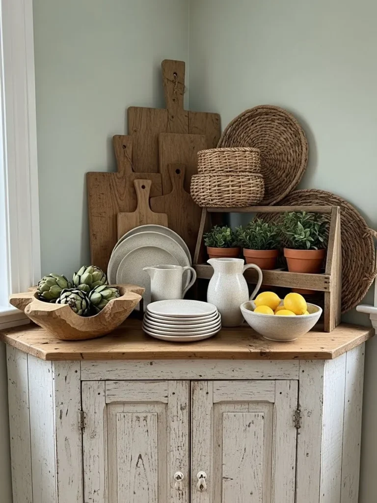This charming farmhouse kitchen corner brings together all the textures and tones that make rustic style feel so warm and collected. The distressed cabinet sets the stage with its soft weathered finish, while the wooden countertop becomes a little styling playground. Stacked cutting boards, woven baskets, simple white dishes and pitchers, and a few leafy potted herbs create a layered look that feels effortless and intentional at the same time. The mix of natural wood, ceramics, wicker, and fresh produce adds so much life to the space without ever feeling cluttered.