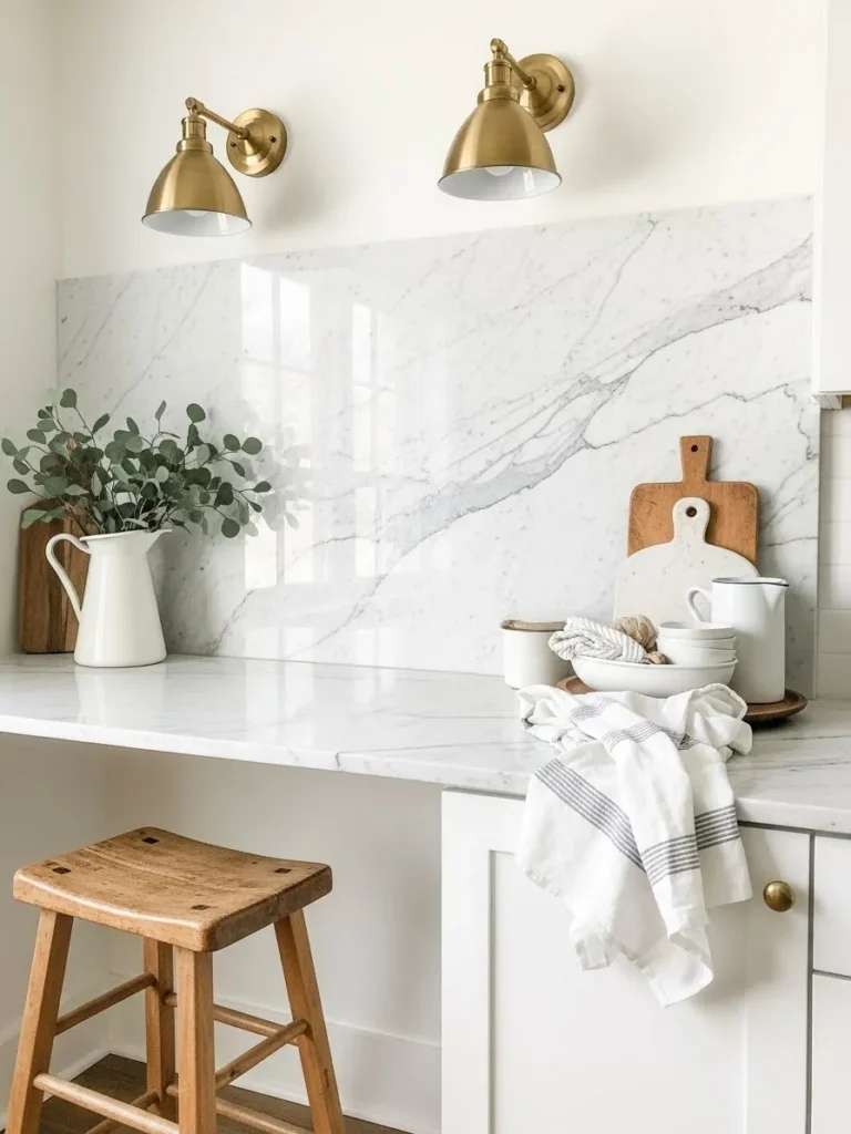This kitchen captures such a lovely balance of clean farmhouse charm and soft modern elegance. The bright marble countertop and full backsplash instantly create a fresh and airy feeling, while the warm wood accents keep everything grounded in cozy country style. The brass sconces add a gentle golden glow that feels both practical and pretty, and I love how the simple white cabinetry lets the textures and natural materials shine. Even the little touches like stacked dishes, a striped tea towel, and a pitcher of greenery make the space feel lived in without ever looking cluttered.
