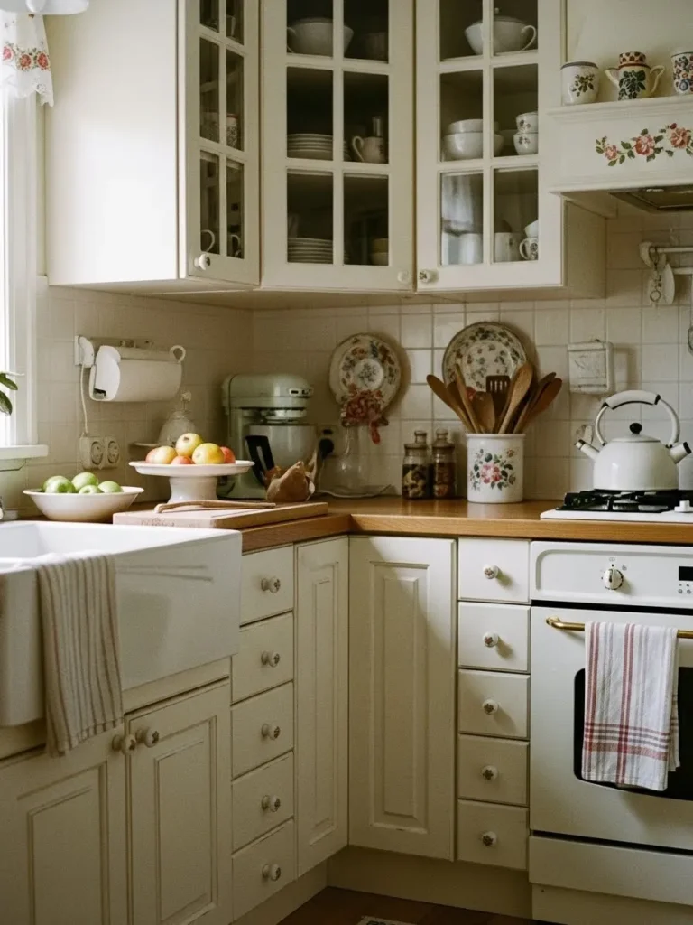 This sweet little corner kitchen feels like it was lifted straight out of a cozy countryside cottage. Soft cream cabinets with classic raised panel detailing create a warm and welcoming backdrop, while the glass-front uppers show off stacks of pretty dishes that bring so much personality into the space. The warm wood countertops add a natural touch that keeps everything grounded. I also love how the floral accents appear in the ovenware, mugs, and even the range hood trim, making the whole kitchen feel thoughtfully curated. The farmhouse sink, the floral crock filled with wooden utensils, and the vintage-style hardware all work together to give this kitchen that gentle, lived-in charm that farmhouse lovers adore.