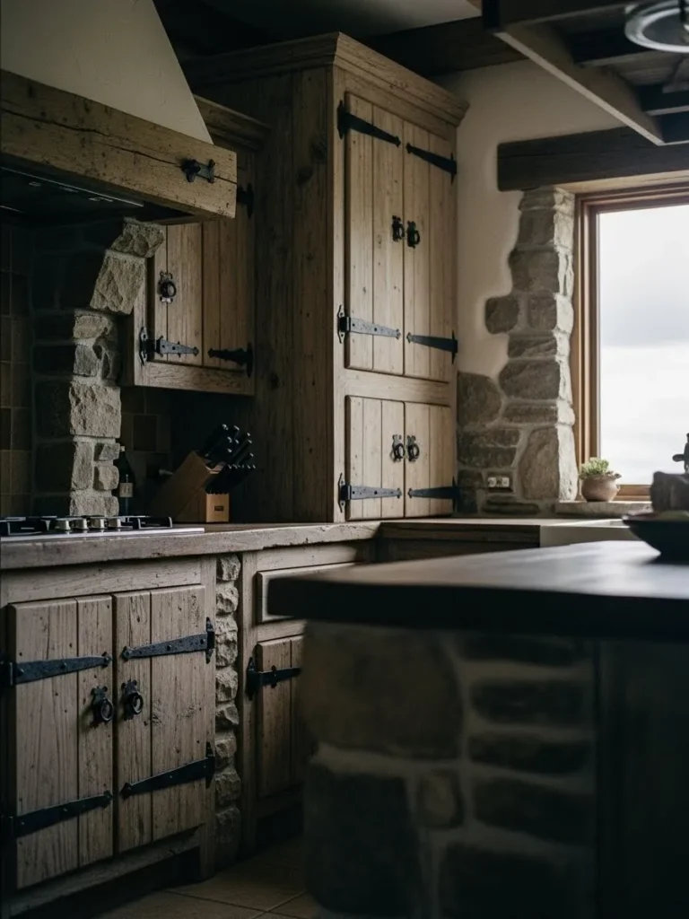This kitchen brings together rugged stonework and timeworn wood cabinetry to create a rich and grounding farmhouse feel. The cabinet doors feature bold black iron hinges and ring pulls that instantly stand out and set the tone. Every surface feels intentional from the heavy wooden vent hood to the textured stone framing the stove area. The muted color palette keeps everything warm and earthy while the handcrafted hardware adds a sense of old world craftsmanship that feels both practical and stylish.