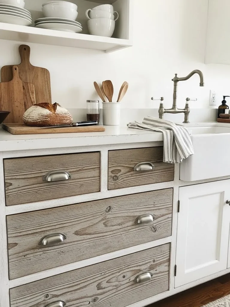 This cozy farmhouse kitchen leans into that warm simple charm we all secretly crave. The drawers are fitted with soft weathered wood fronts that show off the prettiest natural grain patterns. Each one is finished with classic brushed nickel cup pulls that feel both practical and polished. The creamy white countertops and open shelving keep the whole space feeling fresh while the farmhouse sink and vintage style faucet add that perfect touch of old soul character. Everything sits in this sweet balance of rustic texture and clean modern simplicity.