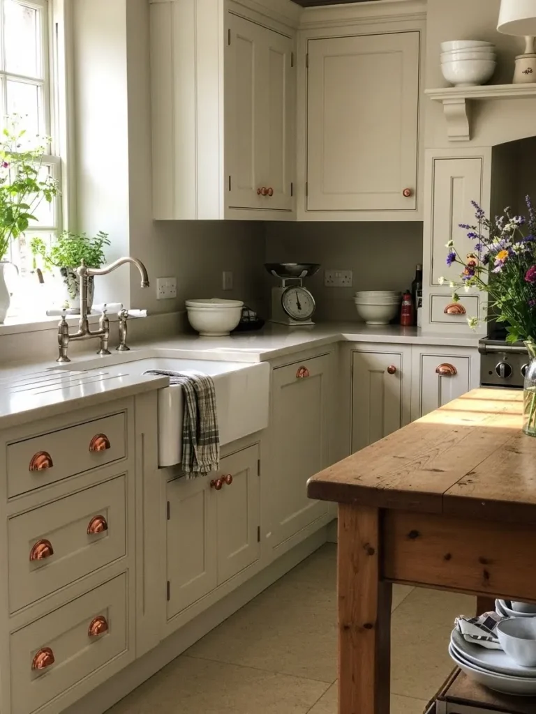This farmhouse kitchen feels instantly welcoming with its soft greige cabinetry and those adorable copper cup pulls that add just the right amount of glow. The classic apron front sink brings in that cottage charm we all secretly love, while the marble style countertops keep everything feeling clean and polished. I also love how the natural light from the window softens the whole space and highlights the warm tones in the rustic wooden island. Little touches like the vintage scale, fresh flowers, and neatly stacked bowls make the room feel lived in without feeling cluttered.