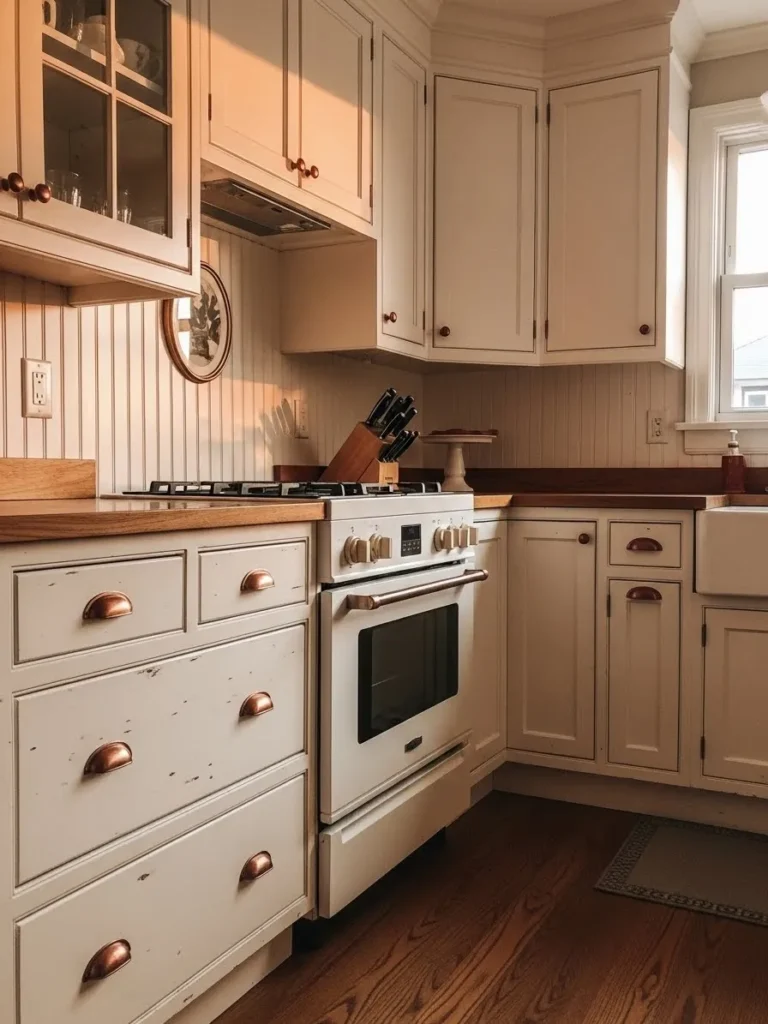 This kitchen has such a soft, lived-in charm thanks to its creamy cabinetry paired with those gorgeous aged copper cup pulls and knobs. The warm wood countertops tie everything together and give the whole space a cozy glow, especially with the sunlight coming through the window. The beadboard backsplash adds that sweet farmhouse texture we all love while the vintage-style range fits right in like it has been part of the home forever. Every element feels thoughtfully chosen, from the delicate glass-front cabinet to the simple framed art on the wall, creating a kitchen that feels inviting and wonderfully timeless.