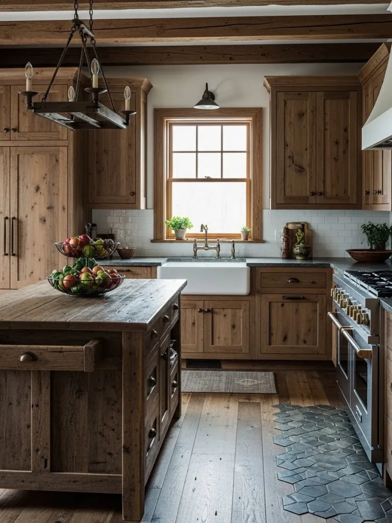 I adore how this design leans fully into its rustic roots without feeling dark or overwhelming. The iron hardware adds so much character and makes the cabinets feel like something you’d find in a cozy countryside cottage. There is a natural sturdiness in every detail and it makes the whole space feel safe and welcoming. I love how the stone and wood work together and the hardware ties everything together so elegantly. It is the kind of kitchen that instantly makes you want to light a candle, put on a soft sweater, and enjoy a quiet evening at home.