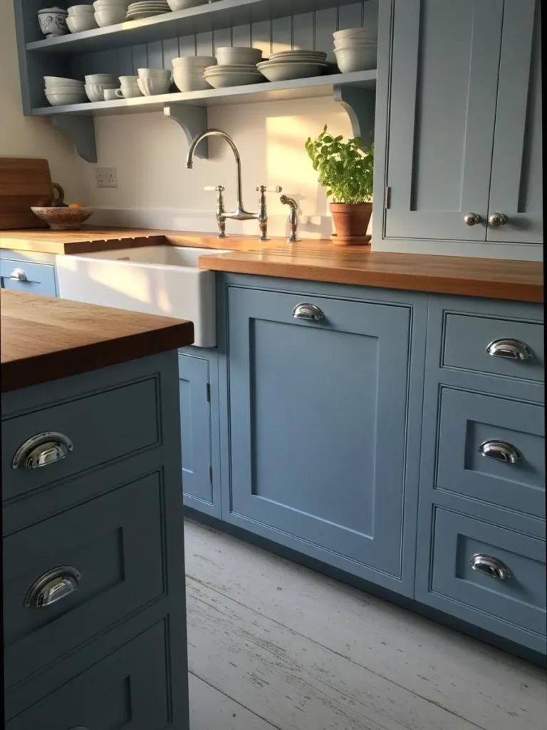 This charming farmhouse kitchen pairs soft blue shaker cabinets with beautifully polished cup pulls that instantly make the space feel neat and refined. The warm butcher block countertops add a cozy touch while the apron front sink brings in that classic farmhouse charm everyone adores. Open shelving filled with simple white dinnerware keeps the look airy and relaxed. The soft evening light pouring across the countertop highlights the clean lines of the hardware and gives the whole kitchen a warm and welcoming glow.