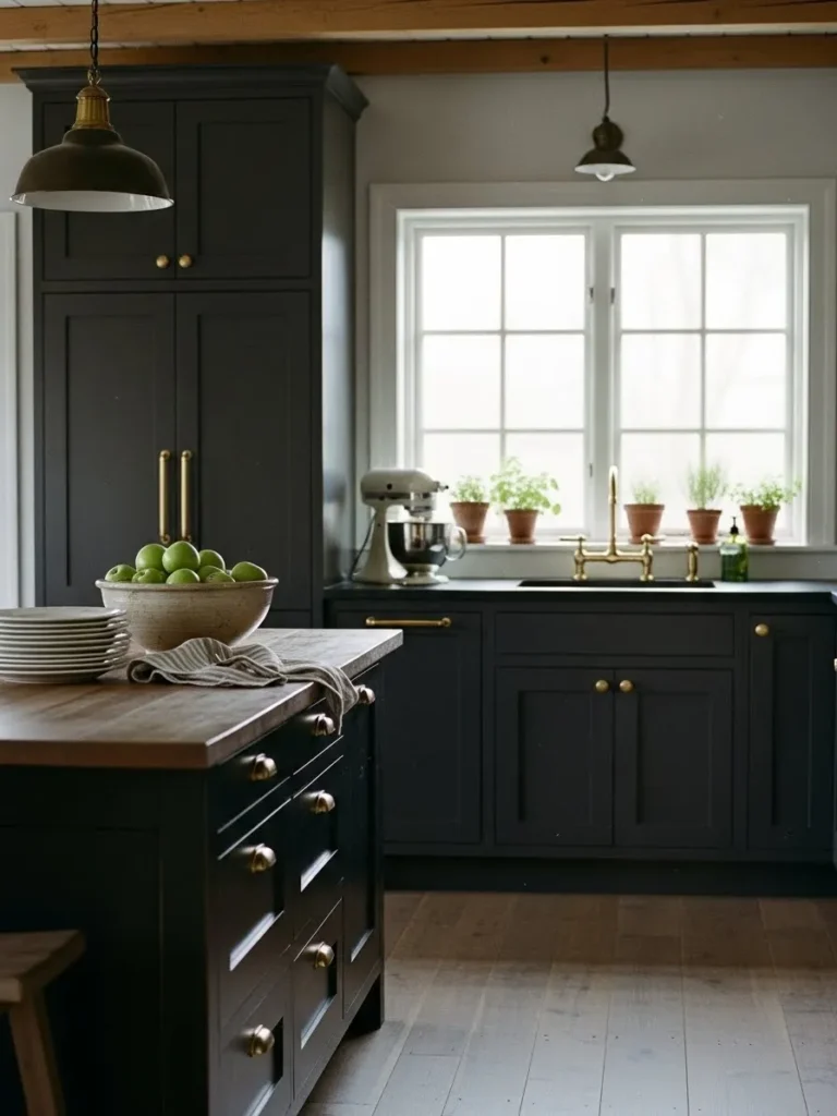 This kitchen brings together rich charcoal cabinetry and classic brass hardware in a way that feels both grounded and elegant. The dark cabinets add a cozy depth that instantly makes the room feel more intimate, while the warm brass knobs and pulls bring in the perfect touch of farmhouse charm. The butcher block island softens the space with natural texture and creates a lovely contrast against the deeper tones. Soft daylight filters through the window and highlights the row of potted herbs, adding that subtle lived-in sweetness that makes farmhouse style so comforting.