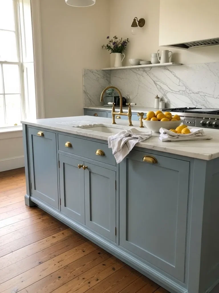 This lovely farmhouse kitchen island brings together the dreamiest mix of soft blue cabinetry, warm brass hardware, and a smooth marble countertop that instantly feels elegant yet completely approachable. The shaker style doors keep things timeless while the polished brass faucet adds a little sparkle without trying too hard. The marble backsplash ties everything together in the prettiest way and the natural light bouncing off the wood floors makes the whole room feel bright and airy. It is one of those islands that looks stylish but also so practical for everyday life.