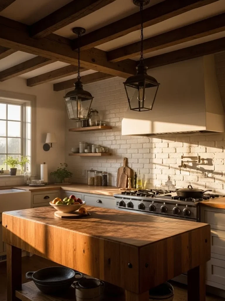 This cozy farmhouse kitchen feels instantly welcoming with its solid butcher block island taking center stage. The thick wooden top has that gorgeous well-loved texture that makes every surface feel warm and lived in. Soft afternoon light washes over the white brick backsplash, open shelving, and classic range, creating the prettiest shadows across the room. The exposed beams and lantern pendant lights add a hint of old-world charm while the simple cabinetry and farmhouse sink keep everything grounded and practical. It is the kind of kitchen that looks beautiful without trying too hard.