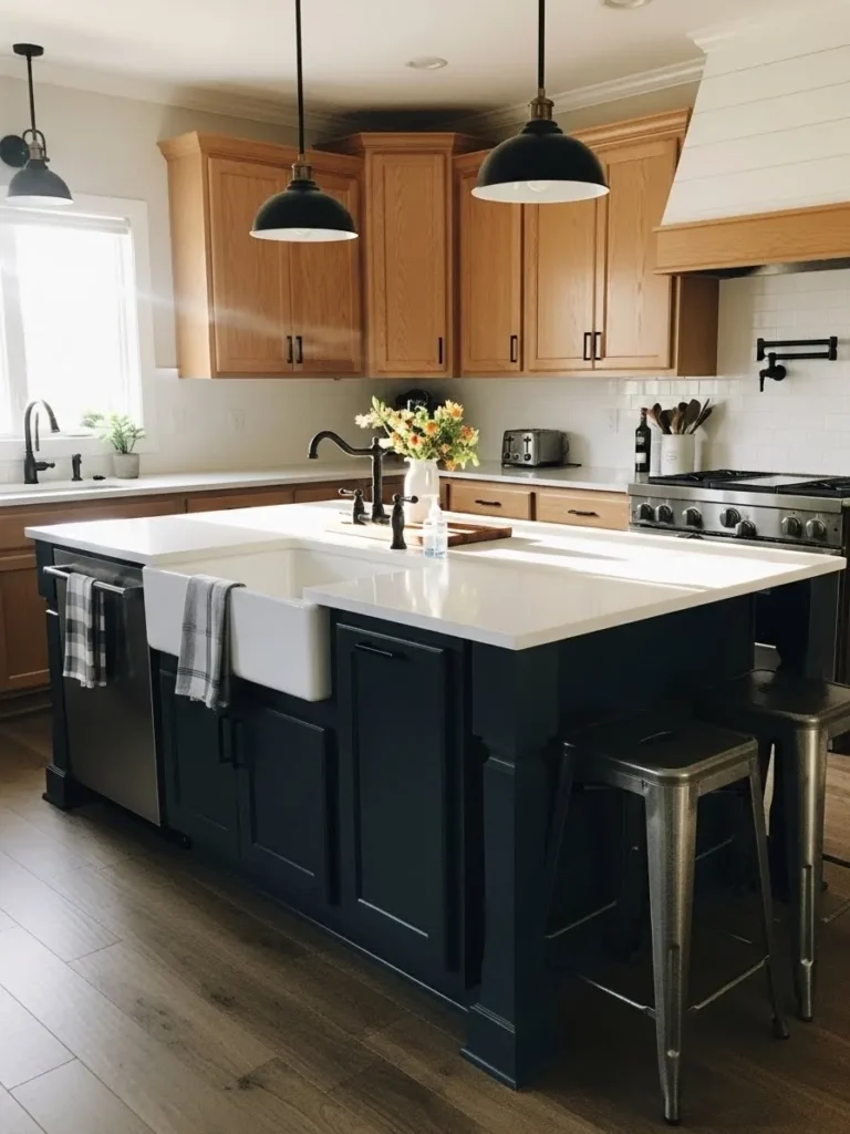 This kitchen brings together the best of classic farmhouse style with a bold modern twist. The navy island instantly grabs attention with its rich color and lovely panel detailing that feels both sturdy and elegant. The white countertop brightens the whole look and pairs beautifully with the big farmhouse apron sink that gives the space that cozy country heart. The warm wood cabinets add softness to the room and make it feel welcoming while the industrial style stools and black pendant lights bring in just the right touch of modern charm. Everything feels balanced and intentional with simple finishes that still feel elevated.