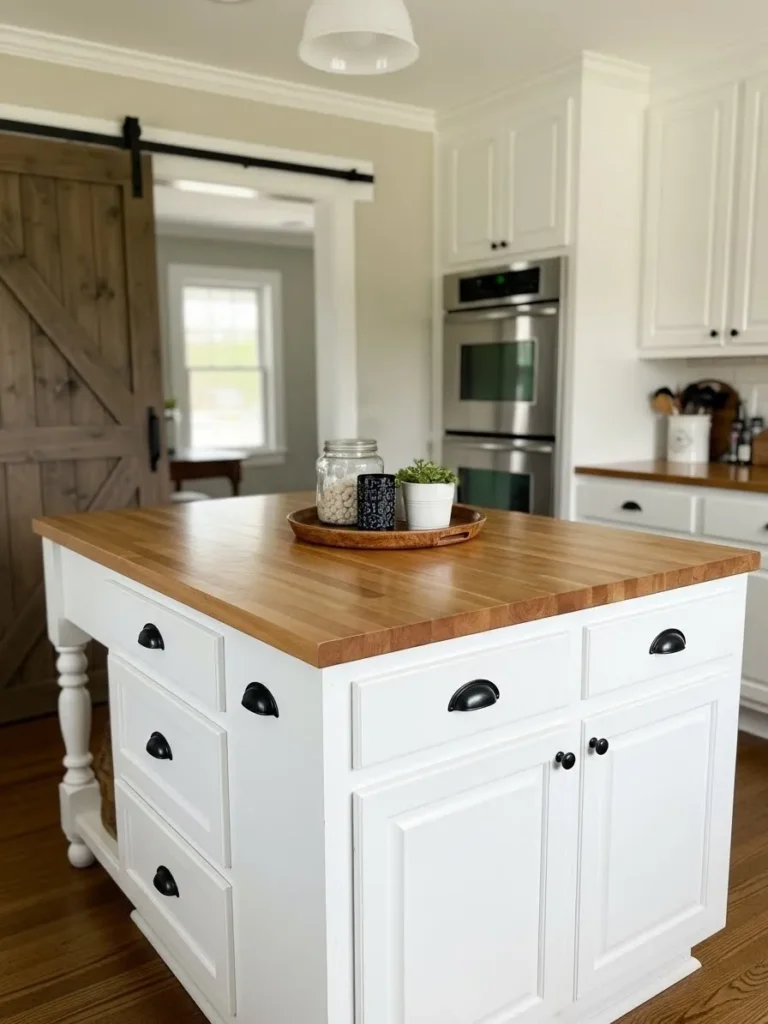 This kitchen design brings together all the cozy farmhouse vibes in the sweetest way. The crisp white island is full of charm with its traditional paneling and deep black cup pulls. The warm butcher block countertop ties the whole space together and adds that inviting lived-in look everyone loves in a farmhouse kitchen. I adore how the soft neutral walls and the sliding barn door add texture and warmth without overpowering the clean cabinetry. The double ovens in the background make the space feel functional and polished while the little tray of jars and greenery keeps everything feeling homey and effortless.