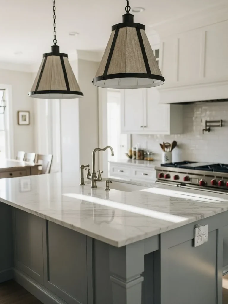 I love how this design blends simple farmhouse comfort with a little modern polish. The marble top makes the whole island feel so fresh and airy while the gray base keeps it grounded in that relaxed country style I never get tired of. Those pendant lights are the kind of thing that make me stop and stare because they add character without trying too hard. It is one of those kitchens where everything feels calm and intentional and honestly I could picture myself spending an entire morning here with my coffee.