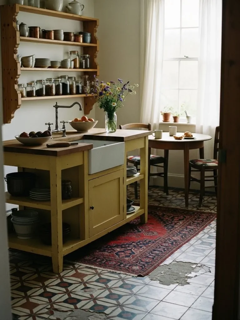 This charming farmhouse kitchen leans into a warm and worn-in cottage look with its buttery yellow island, classic apron-front sink, and open shelves filled with everyday jars and ceramics. The patterned tile floor adds personality, while the beautifully faded rug softens the space and makes the island feel like a true workstation at the heart of the room. Gentle light from the tall window brightens the cozy layout, and the little breakfast nook in the corner gives the whole kitchen a sweet old-world feel.
