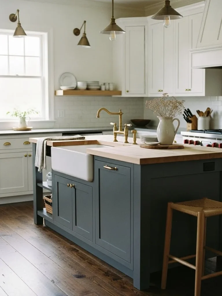 This farmhouse kitchen brings together so many elements that feel timeless and effortlessly stylish. The navy island instantly anchors the room with its rich, cozy color, while the butcher block countertop adds that warm, homey texture everyone loves in a true farmhouse space. The apron front sink gives it that classic charm, and the soft brass hardware and fixtures add a touch of quiet luxury. With white cabinetry framing the space, simple open shelving, and warm wood floors tying everything together, the whole room feels both polished and lived in. The lighting is simple and elegant, giving the kitchen a soft glow that feels welcoming any time of day.