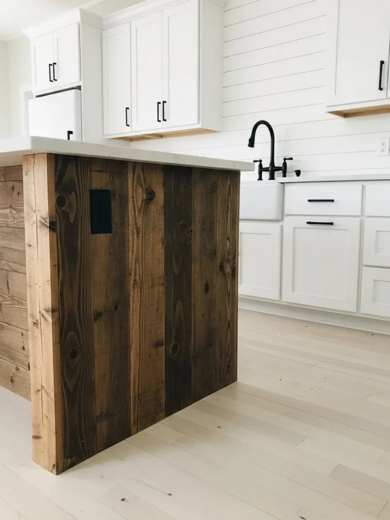This kitchen design features a beautifully simple farmhouse island wrapped in rich rustic wood panels that instantly warm up the space. The natural knots and deep grains in the wood bring so much texture to the mostly white kitchen, creating that perfect contrast farmhouse lovers adore. Paired with crisp shaker cabinets, matte black hardware, and a classic apron-front sink, the whole room feels clean yet cozy. The light floors and white shiplap keep everything bright while the island adds that grounded, earthy focal point every farmhouse kitchen needs.