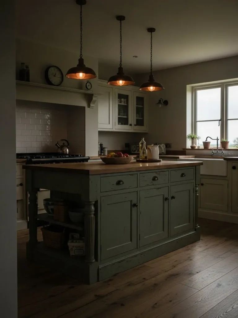 This farmhouse kitchen feels like the kind of space that instantly wraps you in warmth. The muted green island takes center stage with its beautifully aged finish, chunky turned legs, and plenty of storage that makes it both practical and full of personality. The warm wood countertop brings a soft contrast that feels so homey, especially paired with the glowing pendant lights overhead that create the loveliest evening ambiance. Classic cream cabinetry, rustic accessories, and the gentle natural light drifting through the window make the whole room feel lived-in and effortlessly welcoming.