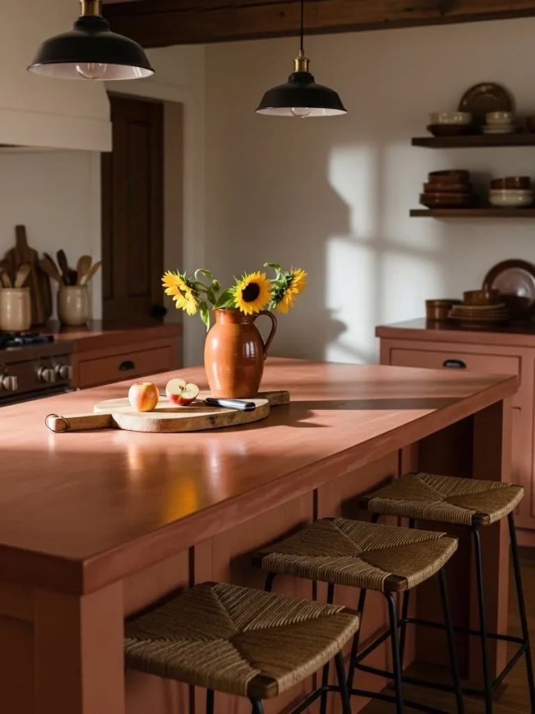 I adore this design because it feels like a warm hug after a long day. The sunlight hitting that terracotta surface is just gorgeous and instantly makes the whole kitchen feel cheerful. The island has this effortless farmhouse personality that feels both stylish and grounded. It’s the kind of spot where I’d happily sip my morning coffee, slice apples for a snack, or chat with a friend while cooking. It just feels happy and homey in the best way.