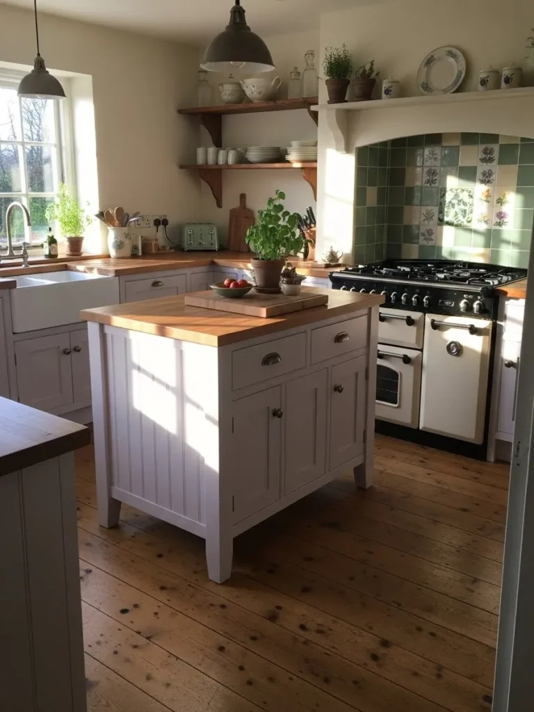 This lovely farmhouse kitchen brings together soft natural light, warm wood textures, and a charming cottage spirit that feels instantly welcoming. The compact island sits right at the center with clean shaker-style panels and a smooth butcher block top that matches the surrounding counters. Sunlight pours across the wood floors and highlights the island like it is the star of the whole room. Open wooden shelves display simple white dishes, and the vintage-style range nook with green floral tiles adds so much character. Everything feels airy and practical with just the right touch of nostalgia.