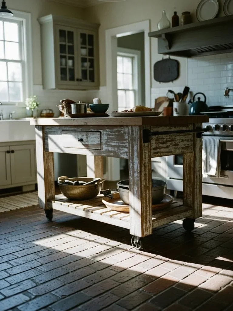 This cozy farmhouse kitchen features a beautifully worn wood island that instantly feels like the heart of the space. The island has a rustic, time-softened finish paired with a thick butcher-block top that brings warmth and texture right into the center of the room. Its open lower shelf is perfect for storing pottery and everyday kitchen pieces, while the small drawer keeps little essentials close at hand. The caster wheels make it easy to move around, giving the whole kitchen a relaxed, unfussy vibe that feels both practical and stylish. With sunlight streaming across the brick floor and soft neutral cabinetry in the background, the entire space feels warm and lived-in in the best possible way.