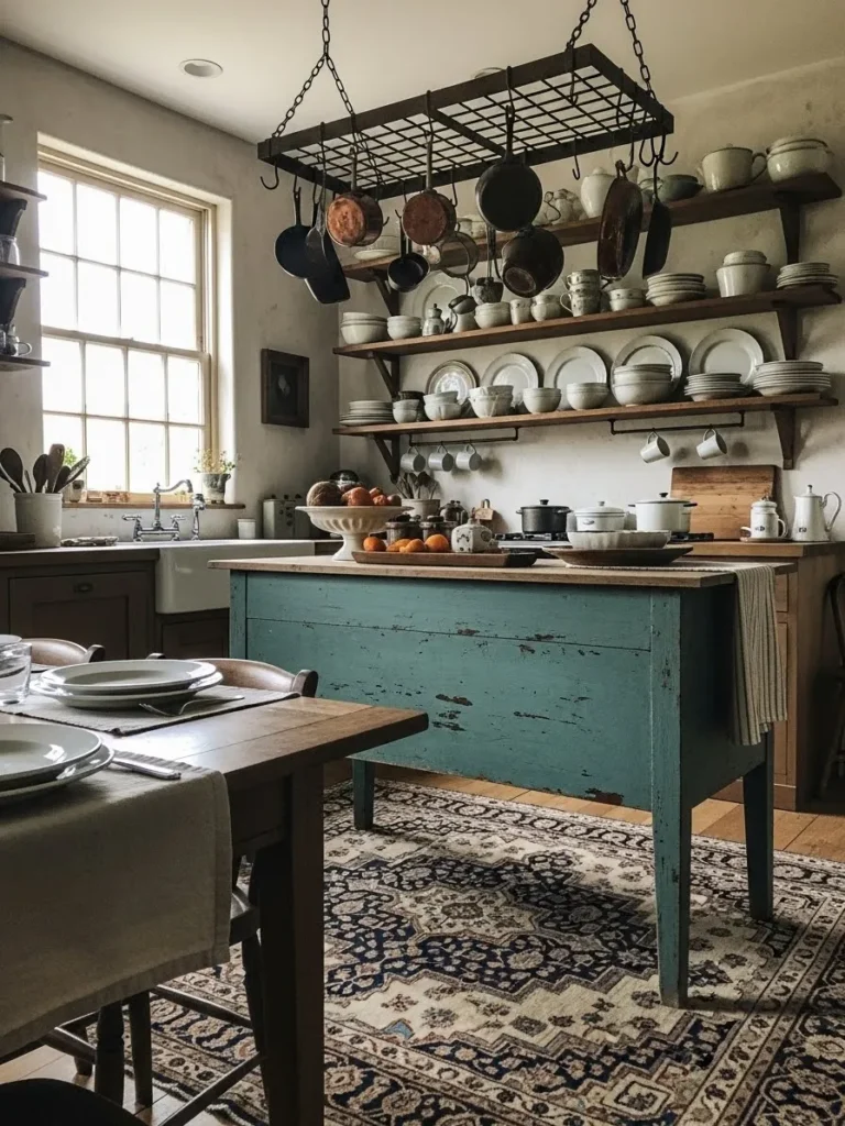 This kitchen brings such a warm and lived in charm with its beautifully weathered blue island taking center stage. The chippy paint gives it that perfectly imperfect farmhouse character that feels like it has its own stories to tell. Open wooden shelves stacked with mismatched white dishes add a cozy cottage feel while the hanging pot rack overhead pulls the whole space together with a touch of old world practicality. Soft natural light pours in through the classic window and highlights the layered textures from the rustic rug to the wooden countertops and all the little details in between.