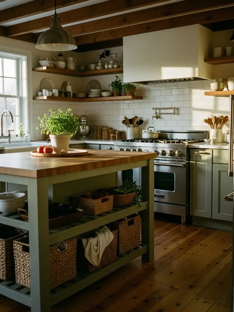 This cozy farmhouse kitchen instantly feels like a warm hug with its soft green island, open shelving, and golden afternoon sunlight pouring across the butcher block. The island itself is wonderfully practical with its sturdy frame, natural wood top, and woven baskets tucked neatly on the lower shelves. Overhead, exposed beams bring a touch of rustic texture, while the white subway tile keeps everything looking fresh and bright. The mix of ceramics, herbs, and little kitchen treasures on the shelves gives the whole space an inviting lived in feeling that feels both pretty and purposeful.