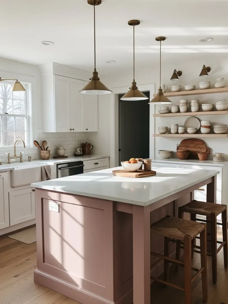 This lovely farmhouse kitchen features a blush toned island that instantly softens the whole space in the prettiest way. The crisp white quartz countertop keeps everything feeling fresh and breezy, while the surrounding white cabinetry and classic farmhouse sink create that timeless country look we all adore. Warm brass pendant lights bring in a touch of vintage charm, and the open shelving filled with textured ceramics adds the sweetest handmade feel. Natural wood stools and a soft wash of sunlight make the entire room feel welcoming and lived in.