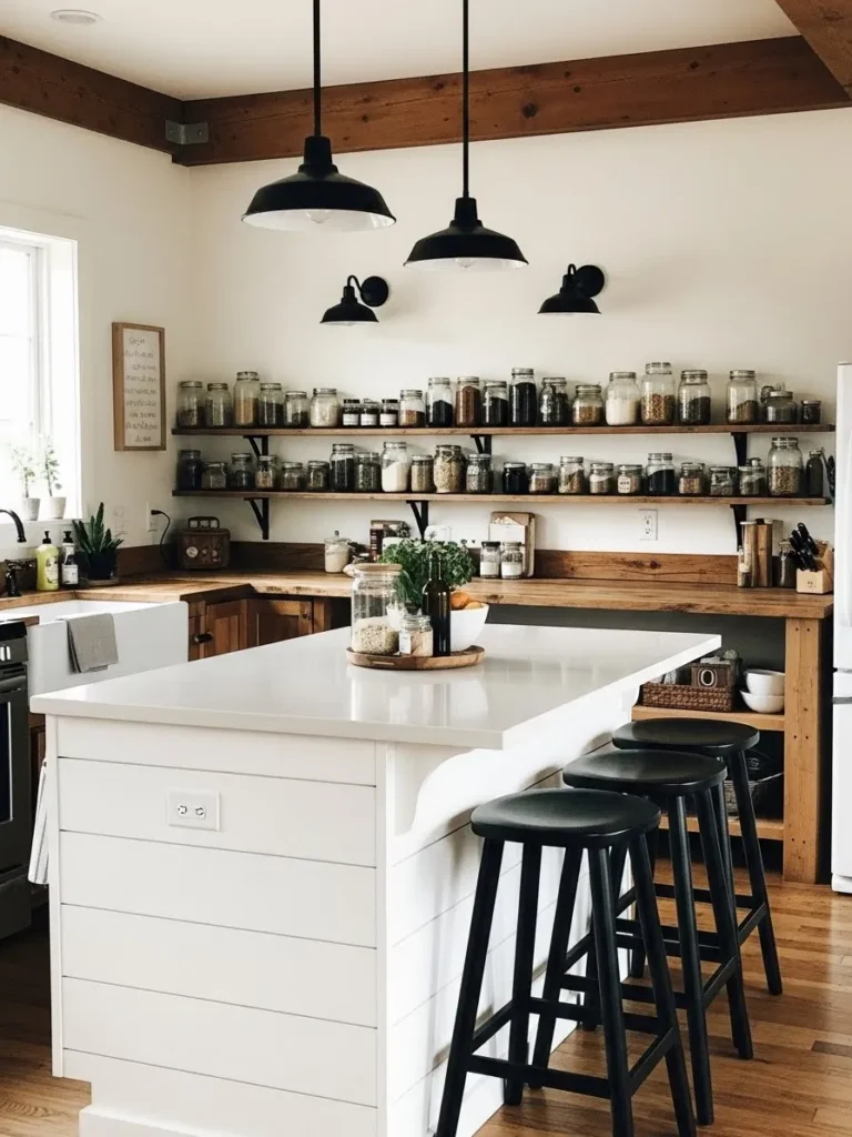 This kitchen brings together everything we love about warm farmhouse style with a clean modern twist. The bright white island feels fresh and crisp, especially paired with the soft shiplap detailing along the sides. Black stools add a grounded touch that keeps the space from feeling too sweet. My favorite feature has to be the open shelving packed with jars of grains, spices, and little kitchen treasures. The natural wood tones from the beams and shelves balance the white beautifully and make the whole room feel cozy and lived in. The pendant lights add that perfect classic farmhouse touch without overpowering the space.
