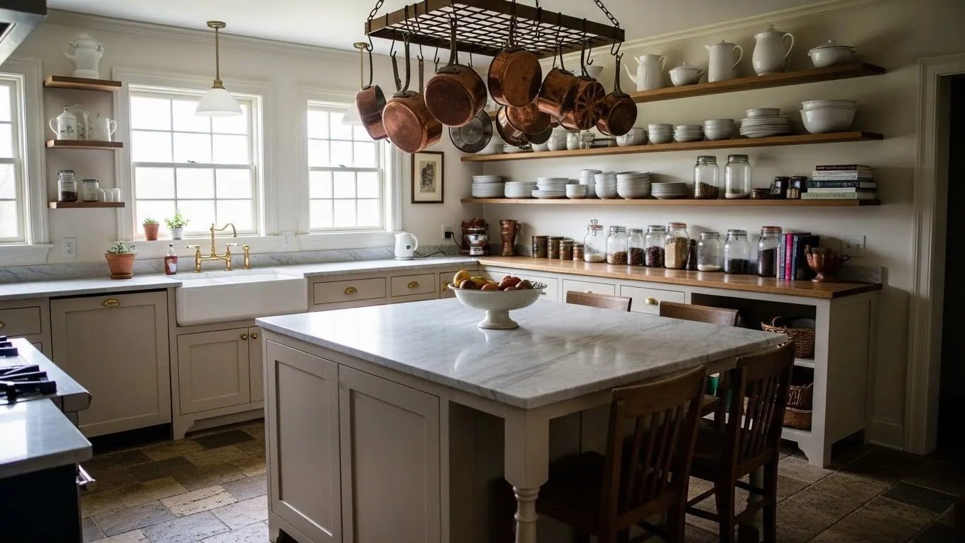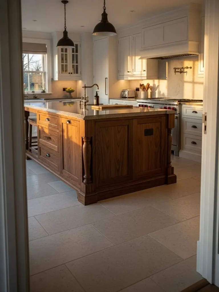This kitchen features a rich wooden island that instantly becomes the star of the room. The island has beautiful carved legs, deep storage drawers, and a warm natural grain that feels timeless and cozy. Soft sunlight filters through the windows and warms the creamy white cabinetry, giving the whole space that golden farmhouse glow. The oversized pendant lights add a touch of vintage charm, while the marble style countertop keeps everything looking crisp and polished. It is the kind of kitchen that feels prepared for slow mornings and big family meals without losing an ounce of elegance.