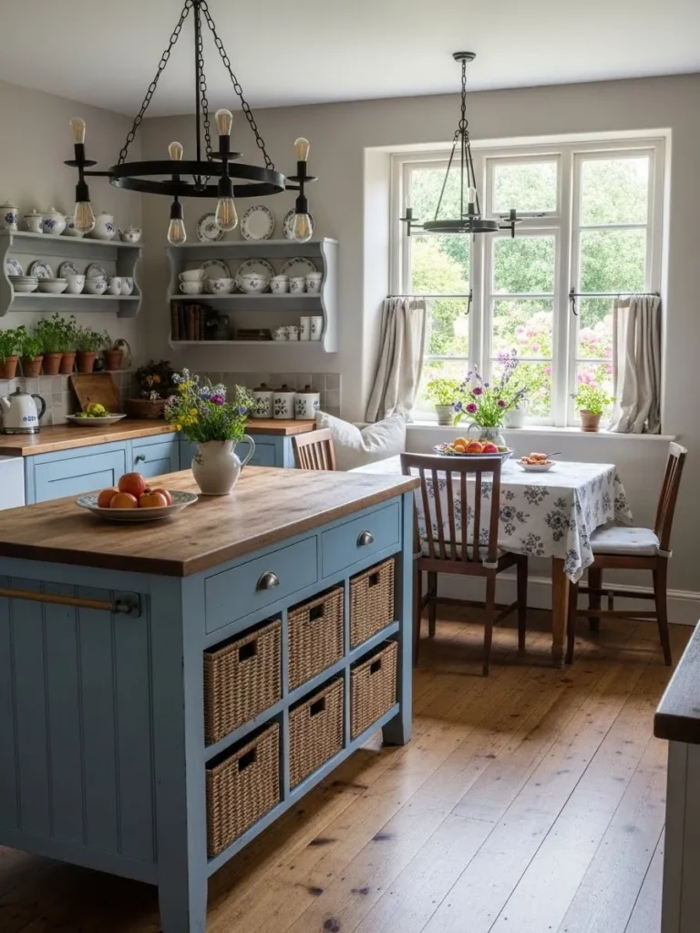 This sweet farmhouse kitchen features a powder blue island that feels both practical and pretty. The island has a warm wood top that instantly softens the whole space and woven basket drawers that bring in that cozy cottage energy everyone secretly dreams about. The surrounding room adds to the charm with open shelves filled with simple white dishes, a window nook dressed in soft curtains, and a table that looks perfect for long chats over tea. Natural light pours in from the big window and makes every detail feel even more inviting.