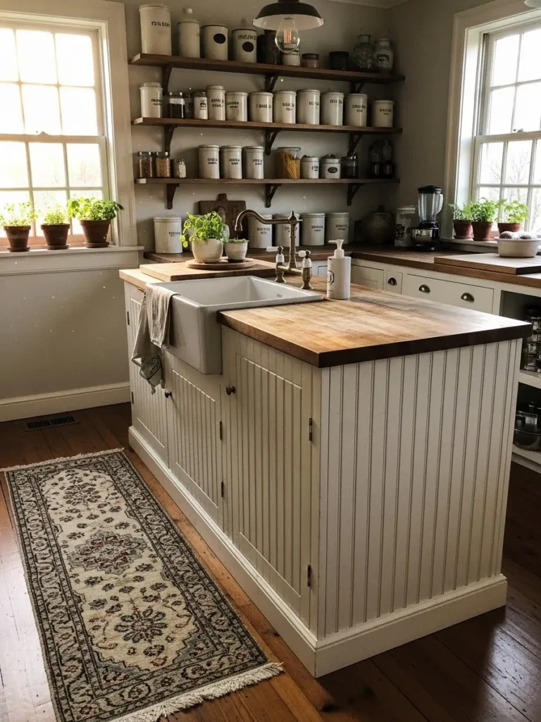This cozy farmhouse kitchen island brings together beadboard cabinetry, rich butcher block countertops, and an apron front sink that instantly gives the whole space that storybook cottage feel. The warm wood tones play beautifully with the sunlight streaming through the windows while the open shelves filled with labeled jars add the sweetest touch of everyday charm. I love how the island feels practical but still so pretty with those potted herbs perched nearby and the classic runner softening the wood floors.