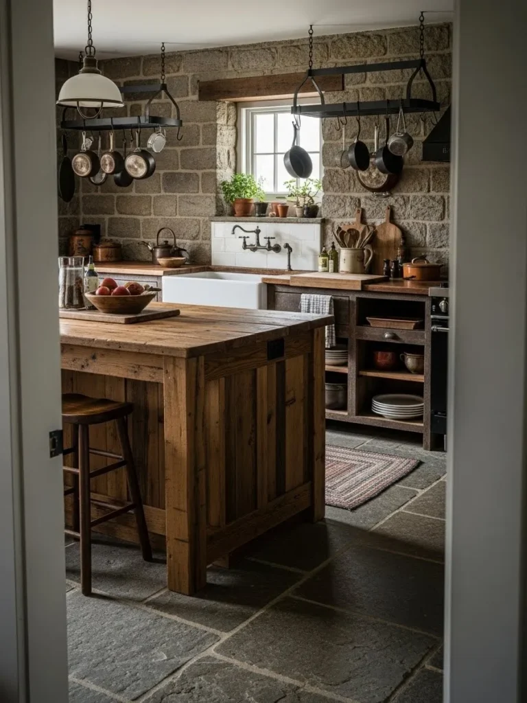 I love this design because it feels like the kind of kitchen where you can cook barefoot on a Sunday morning and not worry about a thing. The wood island has that perfect rugged beauty that makes you want to chop vegetables right on it even though you probably shouldn’t. The stone flooring and walls create such a calm backdrop and honestly I could stare at that window ledge of herbs all day. Everything feels authentic and welcoming which is exactly what I want in a farmhouse kitchen.