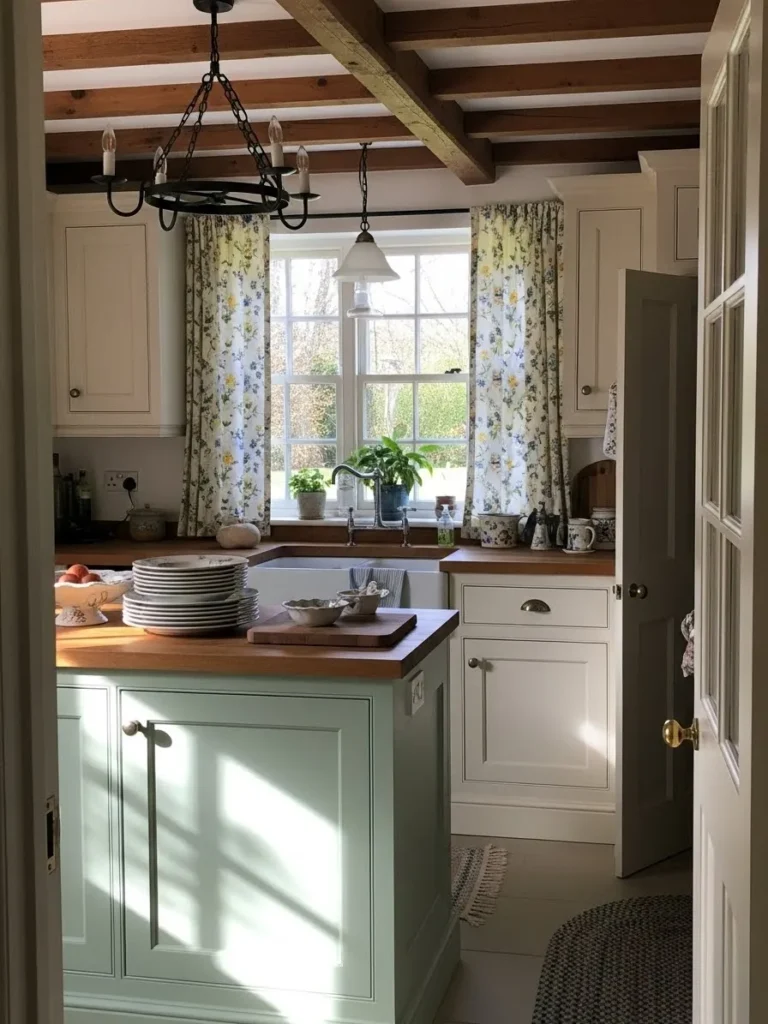 This kitchen brings the sweetest mix of cottage warmth and farmhouse personality. The soft sage island instantly steals the scene with its calming pastel tone, beautifully paired with a warm wood countertop that feels both practical and welcoming. Sunlight pours through floral curtains that frame the big window, adding a little storybook magic to the room. The exposed beams overhead give that lived-in farmhouse soul while the classic cream cabinetry keeps everything feeling bright and grounded. Even the small details like stacked plates, ceramic bowls, and a farmhouse sink make the whole space feel lovingly curated.