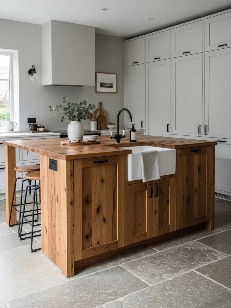 This kitchen features a gorgeous blend of rustic warmth and clean modern lines. The island steals the spotlight with its rich natural wood full of character and knots that feel wonderfully authentic. A farmhouse sink sits front and center and instantly adds that classic country charm. The soft gray cabinetry in the background creates a calm and airy backdrop that lets the wood tones shine. The black hardware and faucet add just the right amount of contrast without overwhelming the space. Everything feels balanced and inviting and the stone flooring grounds the entire room with a gentle rustic touch.