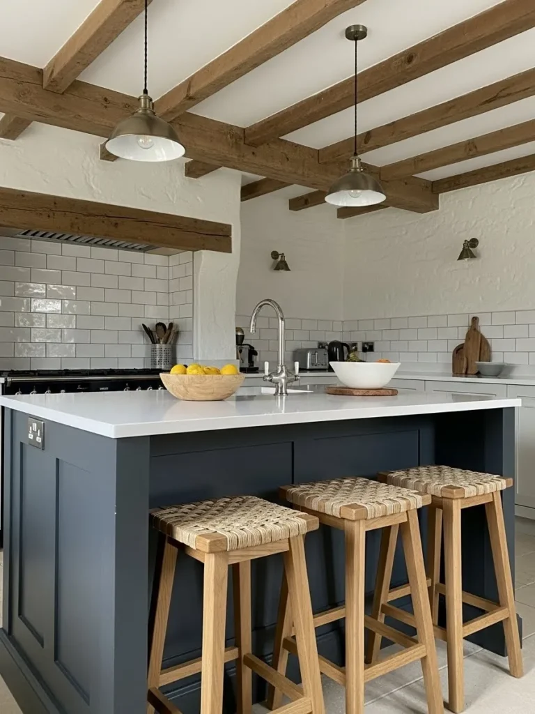 I adore this design because it feels stylish without trying too hard. The navy island gives such a rich grounding moment and those woven stools are the kind of detail that makes me instantly imagine morning coffee chats. The beams add character in the best way and make the whole kitchen feel welcoming. It is one of those kitchens that makes you want to stay a little longer just because it feels so good.