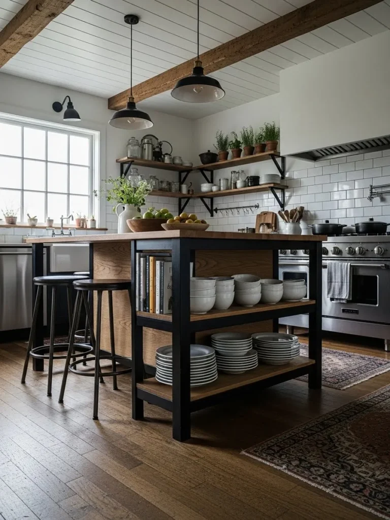 This kitchen design blends warm farmhouse character with a touch of urban edge thanks to its stunning industrial style island. The island features a natural wood top paired with bold black framing that instantly anchors the space. Open shelves display neatly stacked everyday dishes that look both practical and charming. The surrounding room brings in even more farmhouse beauty with exposed wooden beams, bright white shiplap on the ceiling, and classic subway tile along the walls. Black metal stools and vintage style pendant lights tie everything together to create a kitchen that feels stylish yet wonderfully lived in.