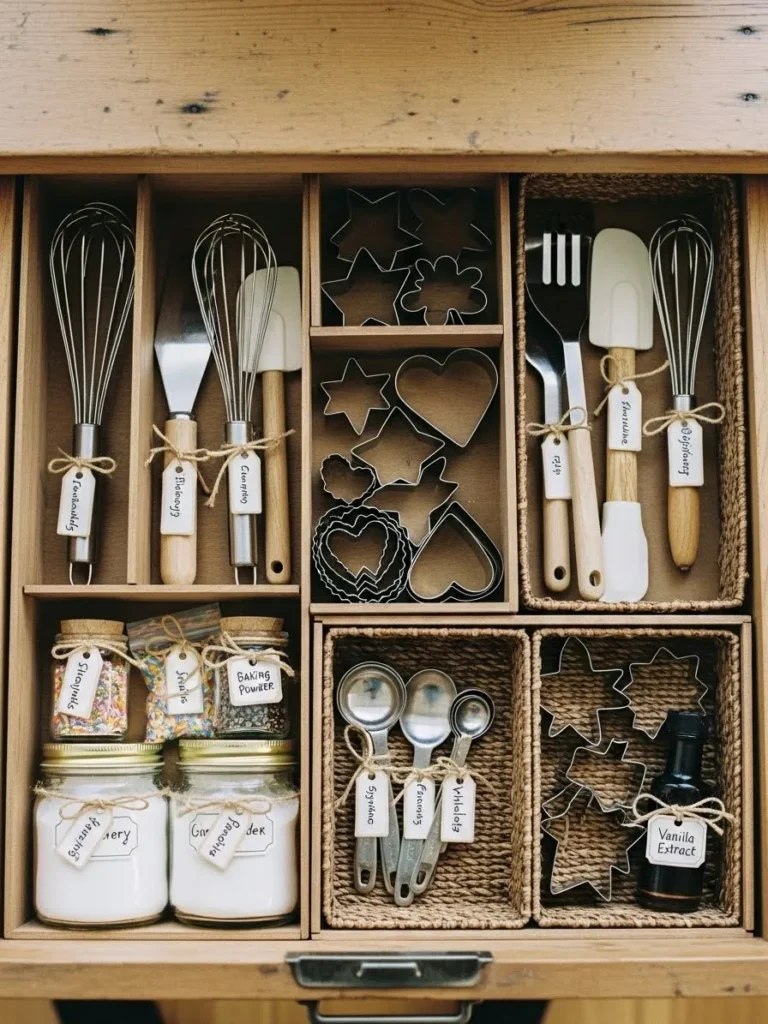 I love how this setup turns a simple drawer into a sweet little baking station. It feels thoughtful and inviting and it reminds me that organizing can actually be fun when it looks this cute. Seeing those labeled jars and neatly tied twine makes me want to roll up my sleeves and start a cookie project. It is such a lovely example of how a small change can make a kitchen feel more peaceful and inspiring.