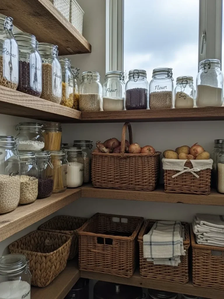 I love how this design feels both practical and pretty at the same time. There is something so calming about seeing grains and pasta lined up in matching jars and those little baskets make the whole space feel warm. It inspires me to stay organized but in a way that still feels relaxed and lived in. It is the kind of setup that makes me want to pour a cup of tea and sort my pantry just for fun.