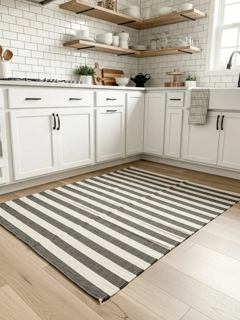 This kitchen leans into that clean modern farmhouse charm with its crisp white cabinetry, warm wood shelving, and glossy subway tile that bounces light around the room. The soft grain of the light oak floors adds warmth while the striped rug instantly anchors the space with a bold but timeless pattern. The contrast of black and white ties effortlessly into the black cabinet hardware and the sleek faucet, creating a space that feels both fresh and cozy. The layout stays open and airy thanks to the floating shelves styled with everyday essentials and a few touches of greenery.